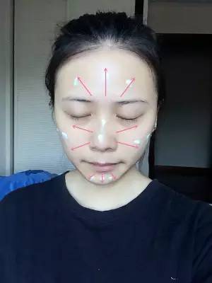 像這樣在臉部各個(gè)部位,隨意點(diǎn)上幾點(diǎn),然后以鼻子為中心,發(fā)散涂抹均勻。鼻翼、眼下用手指按壓使底妝服帖。