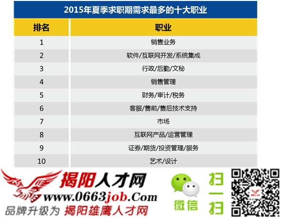 圖為2015年夏季求職期需求最多的十大職業(yè),也就是目前比較稀缺人才的行業(yè),有些職業(yè)是企業(yè)之中不可或缺的職位,有些職位則是由于行業(yè)的蓬勃發(fā)展而不斷增加的職位。總之,這些職位決定你未來做什么,選擇時(shí)一定要慎之又慎。