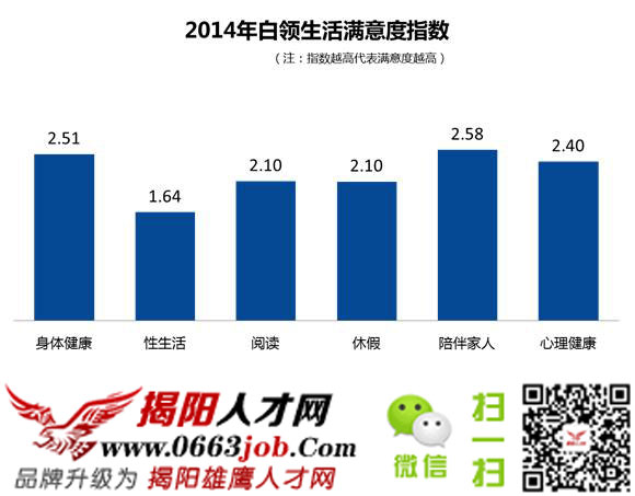 圖為2014年中國白領(lǐng)生活滿意度,中國白領(lǐng)最不滿意的是性生活,滿意度僅為1.64。過半中國白領(lǐng)每月性生活次數(shù)低于1次,其中,46.1%為單身;僅有約1/4的中國白領(lǐng)每周至少過1次性生活。加班、工作壓力較大、出差較多的工作有可能會(huì)導(dǎo)致陪伴家人/伴侶的時(shí)間大大減少,這也是需要大家考慮的因素之一。